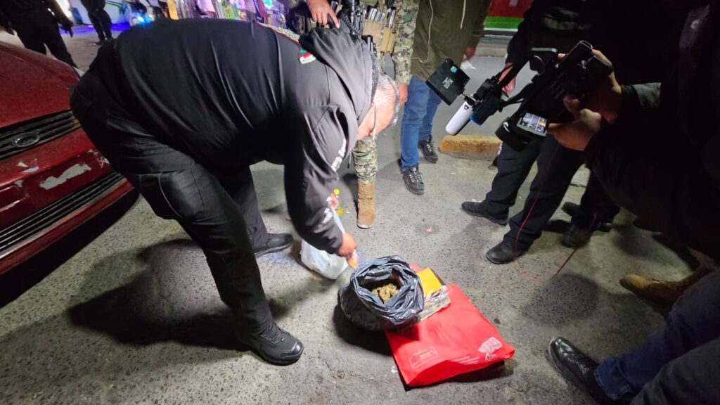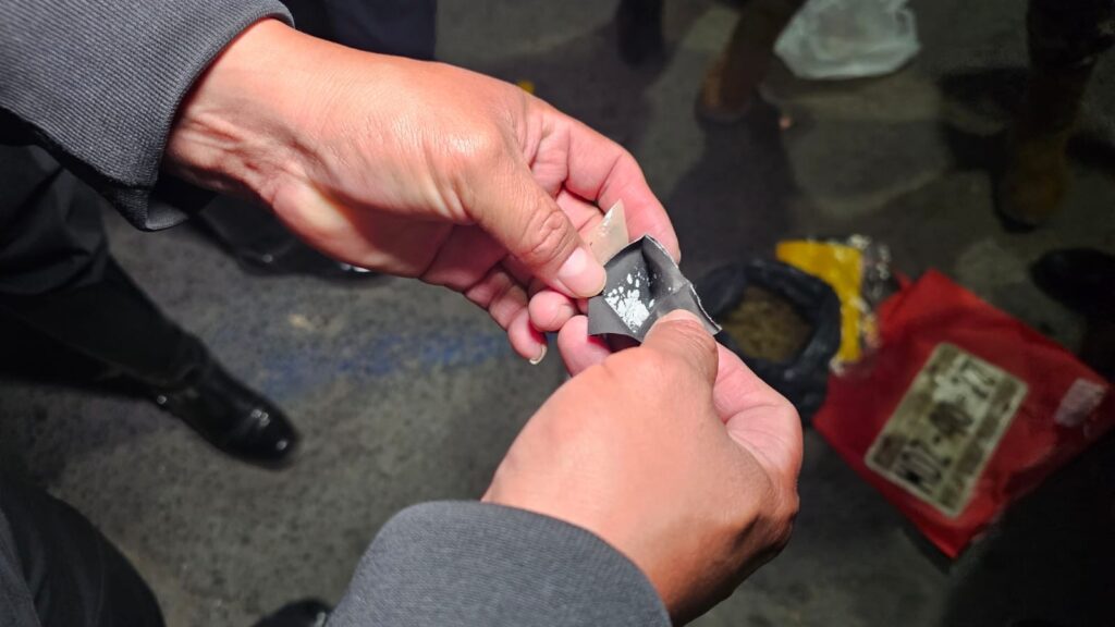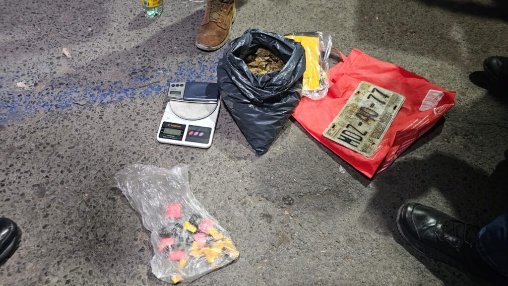 La bolsa contenía 19 envoltorios de piedra sólida, un kilo de hierva verde con características de la marihuana y 10 envoltorios de polvo blanco con características propias de la cocaína, así como una báscula gramera, que fueron presentados ante el ministerio público.
